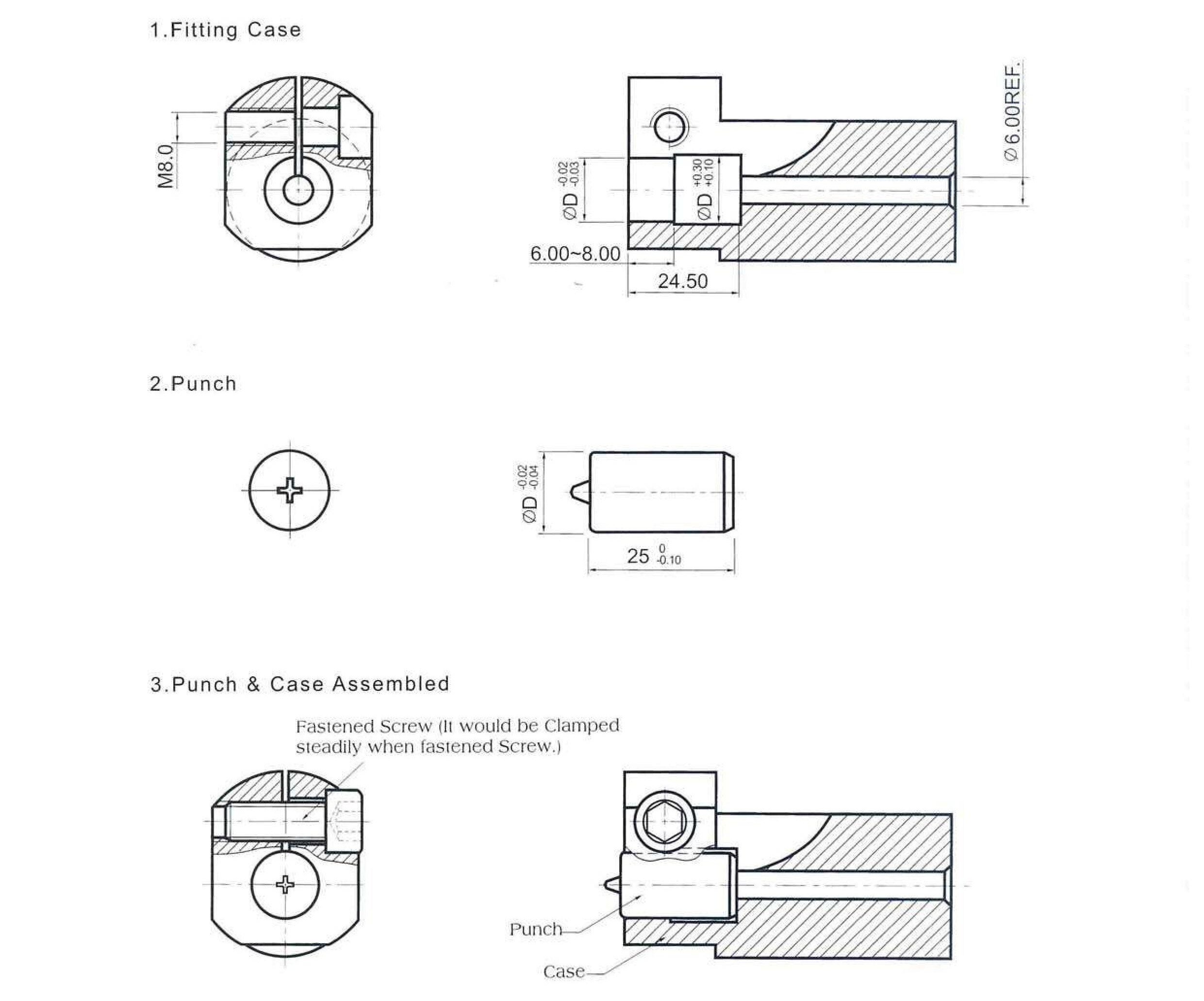 The Clamp Fitting type of Header Punch (Japanese Type ) means to assemble header punch with clamp fitting punch case, as the drawings showed below. The diameter of upper side of clamp fitting is similar to the outer diameter of header punch. The diameter of lower side of header punch case is wider than that of header punch. Ny doing so, the upper side of header punch would be clamped steadily, when fastening the screw.