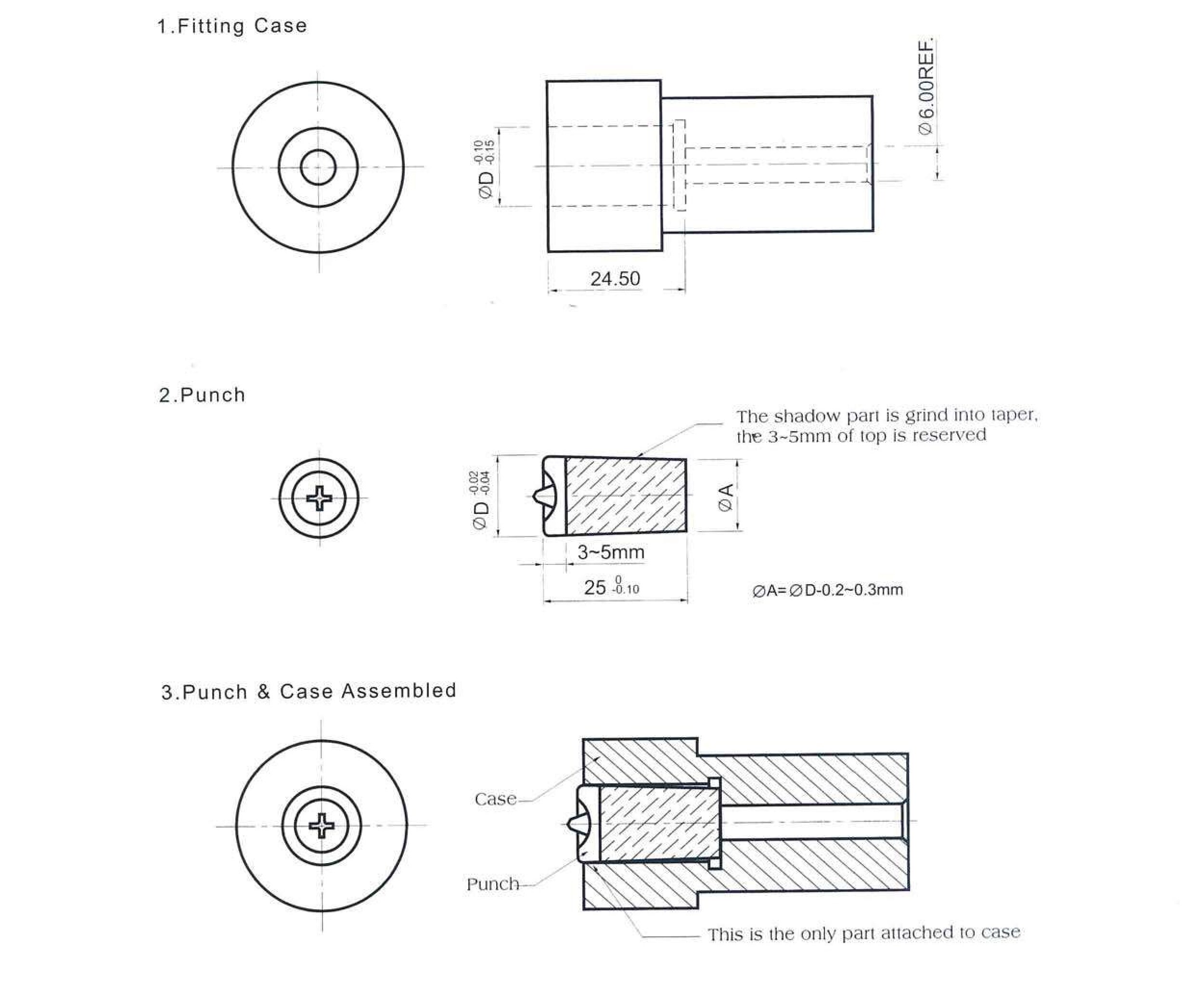 When using a header punch, we put it into a press fitting case, which is called Press Fitting of Header Punch. As the following drawings, the diameter of press fitting case is almost the same to the outer diameter of header punch. The point is that we must reserve 3 to 5 mm on the top of header punch. The rest part of header punch would be ground into taper to assure the top of punch would be the only part attached to punch case, instead of the bottom part of punch. Otherwise the header punch would wabble, which would result in a break of header punch on the indent part of the head when producing a screw with bigger head, the impact is so huge that would cause a break of header punch. Therefore, we suggest that our customers take this king of equipement when producing bigger screws.